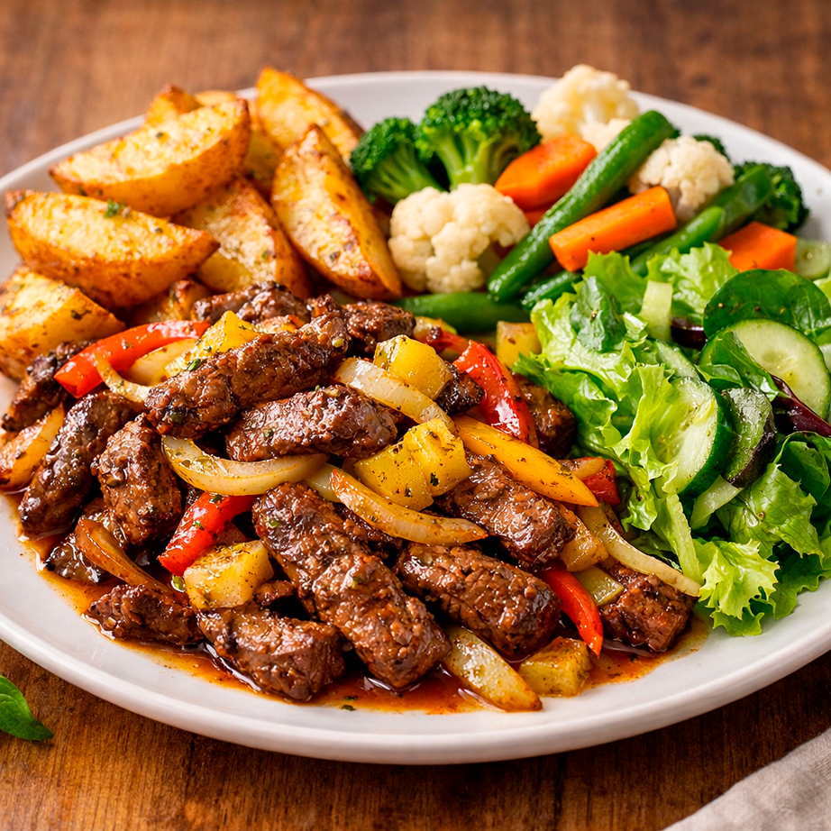 Fajitas de res a la caribeña + gajos de papa + vegetales mixtos al vapor + ensalada verde