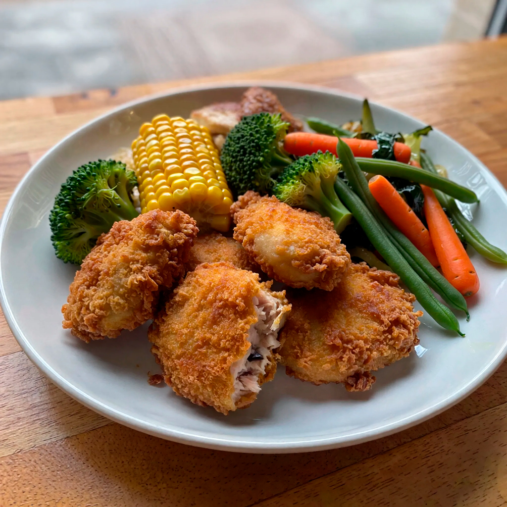 Nuggets de pollo con elote y vegetales
