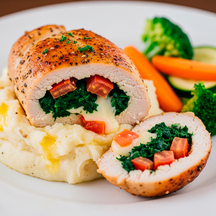 Pechuga rellena de espinaca, tomate y queso + puré + vegetales